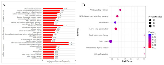 GO enrichment analysis and KEGG pathway analysis of the differentially expressed phosphoproteins of feline small intestine infected with Toxoplasma gondii. (A) The 30 most enriched GO terms belonging to biological process, molecular function, and cellular component are shown. (B) The pathway obtained from KEGG pathway enrichment analysis. Rich factor represents the ratio of the DEP’s number and the number of proteins annotated in the pathway. The higher the rich factor is, the higher the degree of enrichment.