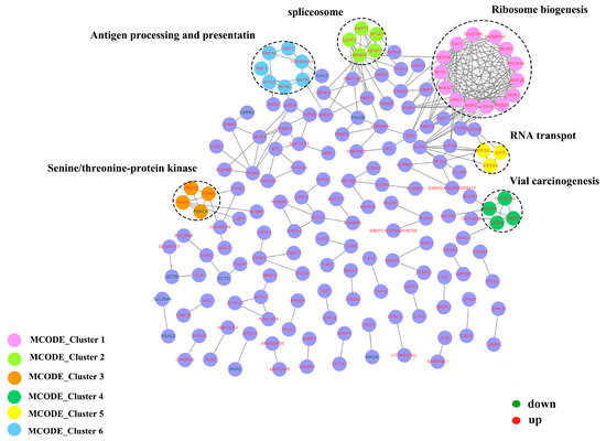 The PPI network was constructed to gain insight into the regulatory mechanisms of phosphorylation modification and determine the interactions between phosphoproteins. A total of 168 differential phosphoproteins (up: 158, down: 10) were mapped into the protein network database (Figure 7). The MCODE analysis revealed relevant subnetworks from six MCODE clusters in Figure 7 (Ribosome biogenesis, spliceosome, Senine/threonine-protein kinase, Vial carcinogenesis, RNA transport, and Antigen processing and presentation), as shown in Table S4. These analysis results are consistent with the GO enrichment results.