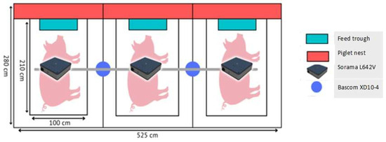 The study was performed at a commercial pig farm with two farrowing units for 64 sows each. Sows were housed in farrowing crates within a farrowing pen, with access to a jute sack in the pen but no straw and a solid concrete floor. Sows were monitored around farrowing, staying in a farrowing pen of 2.80 × 1.75 m with a farrowing crate of 2.1 × 1.0 m. Two Bascom XD10-4 security cameras that showed sound and vision were placed above the pens to record audible sounds and the behaviour of the sow and piglets, with each camera viewing two pens. Three Sorama L642V sound cameras were placed directly above three farrowing pens, with each camera viewing one pen (Figure 1).