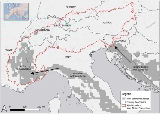 The 21st century is a period in which the recovery of large carnivores has been widely documented in Europe []. Wolves (Canis lupus), after being extensively reduced in the 1800–1900s (Ripple et al. 2014), have been naturally recolonizing the territories of several European countries [,]. Considering the highly controversial status of the species, wildlife managers and governments often face a hostile political landscape to manage the species at the country level [,], usually based on data from national monitoring programs [,,]. However, wolf expansion in Europe is occurring over administrative boundaries and the majority of the wolf populations are shared between countries []. In this framework, Linnell et al. (2008) [] developed the “Guidelines for Population Level Management Plans for Large Carnivores in Europe”, endorsed by the European Commission, where the need to develop monitoring programs at the population level is highlighted for wolves in particular. Wolves are known to roam over large territories of up to several hundred square kilometers [], which may extend beyond administrative borders [], and dispersers are able to move over hundreds of kilometers [,,,]. Therefore, for proper conservation and management issues, it is useful to consider the whole population as a management unit rather than population segments occurring within national boundaries []. The first step to actually manage wolves at the population level is using a monitoring program at such a scale. Even though attempts to officially introduce this concept date back to 2008, few examples of population-level monitoring programs have been developed so far. The greatest success has been achieved in Scandinavia, where large carnivores’ populations have been estimated using cross-national genetic monitoring []; in this case, only two countries were involved (i.e., Sweden and Norway). Other attempts have been conducted for the central European wolf population between Germany and Poland [] and for the Dinaric population between Slovenia and Croatia. However, these approaches were not fully implemented, considering that monitoring standards were agreed upon [] but not yet used and implemented for joint evaluations of the population.