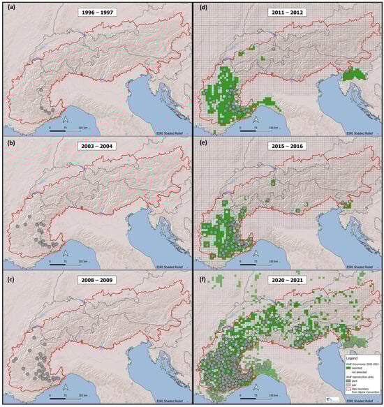 Distribution of reproductive units in the Alps in 1996–1997 (a), 2003–2004 (b) and 2008–2009 (c), together with wolf occurrence for 2011–2012 (d), 2015–2016 (e) and 2020–2021 (f).