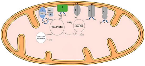 Schematic diagram of flavocoenzymes in mitochondrial energy metabolism (Balasubramaniam et al. [28]). “The OXPHOS system is a 5-enzyme complex which encompasses the mitochondrial respiratory chain (Complexes I-IV), Complex V, and two mobile electron shuttles (coenzyme Q10 and cytochrome c). Electrons derived from oxidation of pyruvate mediated by pyruvate dehydrogenase (PDH) and fatty acid oxidation are transferred via NADH to Complex I (FMN-dependent NADH-ubiquinone oxidoreductase), while electrons from succinate in the Krebs cycle, amino acid metabolism, and fatty acid oxidation are transferred to Complex II (FAD-dependent succinate-ubiquinone oxidoreductase) via FADH2. Electrons are subsequently transferred to ubiquinone (Coenzyme Q10) and then to Complex III (reduced CoQ-cytochrome c reductase), and via cytochrome c to cytochrome c oxidase (COX) (Complex IV), the terminal oxidase of the RC before finally reducing molecular oxygen to water. The free energy liberated during this sequential electron transfer is used to generate an electrochemical gradient of protons, which is finally used by Complex V (ATP synthase or F1F0 ATPase) to drive ATP synthesis from ADP and inorganic phosphate. RF: Riboflavin; RF kinase: riboflavin kinase; Q: Coenzyme Q10; CytC: cytochrome c oxidase; FMN: flavin mononucleotide; FAD: flavin adenine dinucleotide”.