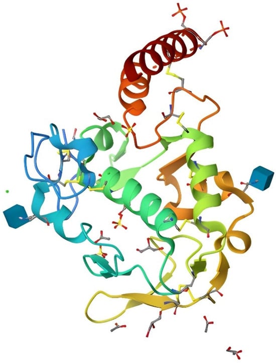 The gene responsible for producing egg white, yolk, and serum RBPs is shared, exhibiting slight tissue-specific disparities in post-translational modifications [68]. RBPs are synthesized by the liver or oviduct in poultry and subsequently released into the bloodstream or eggs [26,78]. The mature and functional form of RBP (depicted in Figure 3) undergoes initial post-translational modifications [73]. This entails cleavage of an unidentified signal peptide, blockade of its amino terminus with pyroglutamic acid, and excision of an 11-13-residue acidic carboxyl-terminal peptide during or after transportation [79]. Additionally, nine disulfide bonds have been identified, along with two N-linked oligosaccharides whose composition varies based on the synthesizing tissue, and a serine-rich region bearing eight phosphoryl groups [73,80,81]. Notably, these phosphoryl groups play a critical role in facilitating the transportation of serum RBP into diverse tissues [75].