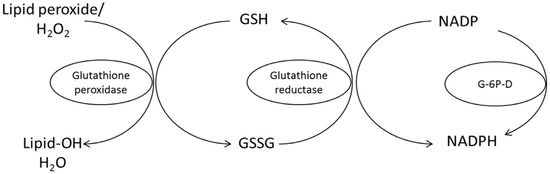 Conversion of oxidized glutathione (GSSG) to the reduced form (GSH) by glutathione reductase requires riboflavin in the flavin adenine dinucleotide (FAD) coenzyme form for its activity (Suwannasom et al. [10]). G-6P-D = glucose-6-phosphate dehydrogenase.