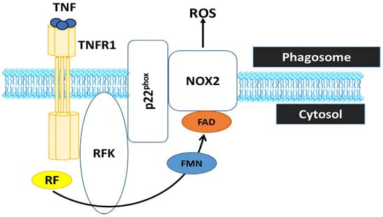 Riboflavin is converted by riboflavin kinase into flavin monophosphate (FMN) and flavin adenine dinucleotide (FAD), which are essential cofactors of the phagocytic NADPH oxidase 2 (Nox2) to generate reactive oxygen species (ROS). Riboflavin deficiency renders the phagocyte Nox2 incapable of producing ROS, a process crucial for deactivating phagocytosed microbes and regulating the inflammatory response in innate immune cells (Suwannasom et al. [10]). TNF = tumor necrosis factor; TNFR1 = tumor necrosis factor receptor 1.