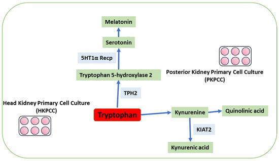 Therefore, this study aimed to describe how supplementation with tryptophan and cortisol modulates the neuroendocrine and kynurenic pathway. We used the mRNA transcription of Tryptophan Hydroxylase (TPH2), 5HT1α receptor, INFγ, and KIAT 2 as markers in the primary cell culture of the head and posterior kidney of coho salmon (Oncorhynchus kisutch) following the pathway (Figure 1).