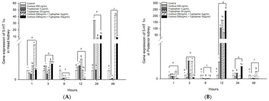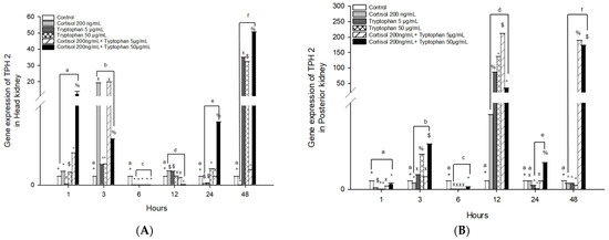 Posterior kidney cells stimulated with cortisol presented an upregulation at 12 h; instead, tryptophan 5 μg/mL presented an upregulation at 3 and 12 h, while tryptophan 50 μg/mL was highest at 12 h. The combined effect of cortisol and tryptophan 5 μg/mL presented an upregulation at 1, 3, 12, and 48 h, and cortisol and tryptophan 50 μg/mL presented the highest levels at 12 and 24 h (Figure 3B and Table 3).