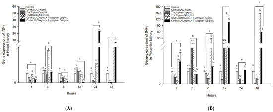 Gene expression of IFNγ in the (A) head kidney primary cell culture (HKPCC) and (B) posterior kidney primary cell culture (PKPCC) of O. kisutch treated with cortisol, tryptophan, and a combination of cortisol and tryptophan at high and low concentrations. Each value represents the mean ± S.E.M. (n = 3). Different letters indicate statistical differences within the same treatment between time points. Symbols (*, °, %, x, $, and +) indicate statistical differences between different treatments (control, cortisol, and tryptophan) at the same time point (three-way ANOVA, p < 0.01).