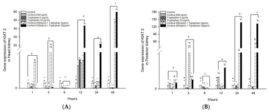 The mRNA gene expression of KIAT 2 in head kidney cells stimulated with cortisol and tryptophan 5 and 50 μg/mL significantly increased at 12 h in O. kisutch (Figure 4A). The combined effect of cortisol and tryptophan 5 μg/mL presented an upregulation at 1, 3, 12, and 48 h, and also cortisol and tryptophan 50 μg/mL presented an upregulation at 12, 24, and 48 h (Figure 5A and Table 2).