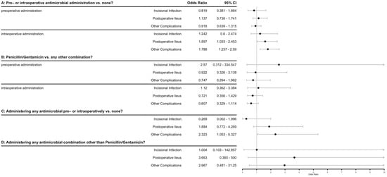 Rockow, M.; Griffenhagen, G.; Landolt, G.; Hendrickson, D.; Pezzanite, L. The Effects of Antimicrobial Protocols and Other Perioperative Factors on Postoperative Complications in Horses Undergoing Celiotomy: A Retrospective Analysis, 2008–2021. Animals 2023, 13, 3573. https://doi.org/10.3390/ani13223573