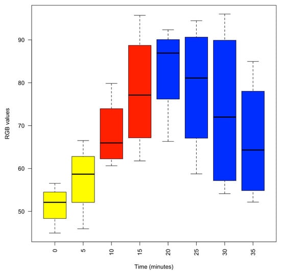 Box plot of the colour intensity of the interbrachial membrane as the concentration of isoflurane was progressively increased and then decreased. Yellow, 1% MgCl2; Red, 1% MgCl2 and 1% isoflurane; Blue, recovery in fresh aerated seawater. Colour intensity was measured using the RGB model whereby a zero intensity (value, 0) for each component gives the darkest colour (no light, considered to be black) and full intensity for each component gives white (value, 255). Thus, the higher the recorded value, the paler the interbrachial membrane and vice versa.