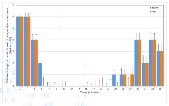 Relative strength of the withdrawal of octopus siphon and arms in response to a touch stimulus versus time (6 = strong, 4 = medium, 2 = low, and 0 = none) in 9 animals; 0–10 min in 1% MgCl2; 10–15 min in 1% MgCl2 and 1% isoflurane; 15–35 min in fresh aerated seawater.