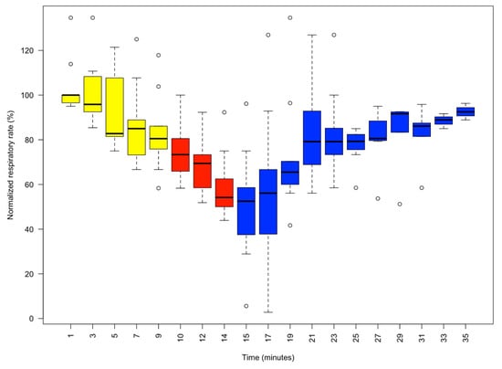 Boxplot of the normalised respiratory rate (%) as determined by the number of mantle contractions per minute in 9 animals. Readings were taken at 2 min intervals. Yellow phase: MgCl2 1% (10 min). Red phase: isoflurane 1% and 1% MgCl2 (5 min). Blue phase: recovery phase in fresh aerated seawater. As respiratory rate variability between animals is substantial, the outlying circles indicate the recorded maximum and minimum normalised respiratory rates. It should be noted that after 10 min in 1% MgCl2, the respiratory rate stabilised at about 80% of its normalised value, followed by a further gradual decline after 1% isoflurane, which was terminated by changing the medium to clean aerated seawater.