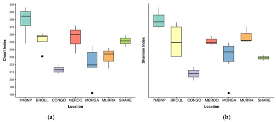 Alpha diversity of southern greater glider gut microbiomes from southeastern NSW. Boxplots show mean alpha diversity of samples at each location, with interquartile range and outlier values indicated. (a) Chao1 index. (b) Shannon index. 7MBNP = Seven Mile Beach NP (n = 4), BROUL = Broulee (n = 4), CONGO = Eurobodalla NP (n = 2), MEROO = Meroo NP (n = 3), MONGA = Monga NP (n = 6), MURRA = Murramarang NP (n = 3), SHARE = Sharewater (n = 2).