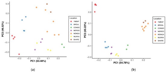 Geographic location was found to significantly influence gut microbial community structure, with dissimilarity in microbiome composition observed among locations (PERMANOVA, p < 0.05) (Table 2). Principal coordinate analysis of Bray–Curtis distances revealed strong clustering of samples based on location, where individuals from the same site had microbiomes that were more similar to each other than to individuals from disparate locations (Figure 3a). This was consistent with the PCoA of Jaccard distances, which similarly showed a strong clustering pattern based on location (Figure 3b). Clustering together of individuals from Monga NP and Sharewater was observed in both plots, as was the clustering of individuals from Meroo NP and Murramarang NP (Figure 3a,b). Individuals from Eurobodalla NP were also clearly separated from individuals from other locations (Figure 3a,b). Jaccard, Bray–Curtis and unweighted UniFrac distances significantly differed between burnt and unburnt sites (PERMANOVA, p < 0.05), although differences in weighted UniFrac distances were not significant (Table 2). No significant sex-based influence on gut microbial diversity was identified (Table 2).