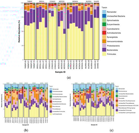 Taxonomic bar plots showing relative abundances of microbial taxa in southern greater glider gut microbiomes. (a) Phylum-level plot. (b) Family-level plot. (c) Genus-level plot. The size of the coloured regions on each plot indicates the proportional contributions (%) of each taxon to total composition (100%). Individuals sampled from various geographic locations across southeastern NSW. 7MBNP = Seven Mile Beach NP (n = 4), BRO = Broulee (n = 4), CONGO = Eurobodalla NP (n = 2), MEROO = Meroo NP (n = 3), MONGA = Monga NP (n = 6), MUR = Murramarang NP (n = 3), SW = Sharewater (n = 2). Plots generated in R v4.3.1.