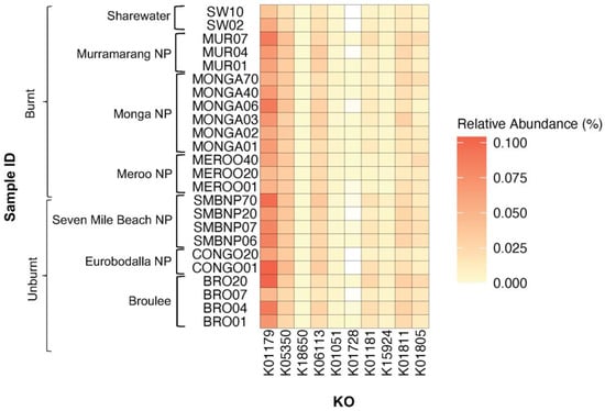 Comparison between individuals from burnt and unburnt sites also revealed some differences in the expression of fibre-degrading KOs (Figure 5, Table A4). K01179 (endoglucanase) had a significantly higher abundance in the gut of individuals from unburnt sites (0.081%) compared to burnt sites (0.063%) (Wilcoxon rank sum test, S = 165, p < 0.05). Similarly, K15924 (Glucuronoarabinoxylan endo-1,4-beta-xylanase) had a significantly higher abundance at unburnt sites (0.0062% in unburnt vs. 0.0028% in burnt) (Wilcoxon rank sum test, S = 180, p < 0.05). In contrast, K01181 (endo-1,4-beta-xylanase) had a higher abundance at burnt sites (0.0095% in burnt vs. 0.016% in unburnt) (Wilcoxon rank sum test, S = 171, p < 0.05).