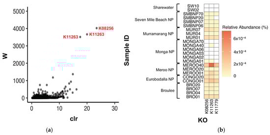 ANCOM was also used to test for significantly differentially abundant KOs between southern greater glider gut microbiomes. Three KOs were found to be differentially abundant between locations, K08256 (W = 4022), K11779 (W = 3514) and K11263 (W = 3665) (Figure 6a). K08256 had the greatest relative abundance in individuals from Meroo NP (0.00016%) and Eurobodalla NP (0.00015%), followed by Murramarang NP (0.00011%), Broulee (0.00010%) and Seven Mile Beach NP (0.00003%). The KO was also detected at very low abundance in one individual from Monga NP (<0.00001%) but was absent in individuals from Sharewater (Figure 6b, Table A5). Following a similar pattern, K11779 also had greater relative abundances at Meroo NP (0.00016%) and Eurobodalla NP (0.00015%), with lower abundances detected in Murramarang NP (0.00011%), Broulee (0.00010%) and Seven Mile Beach NP (0.00003%), although the KO was absent from individuals from Monga NP and Sharewater (Figure 6b, Table A5). Finally, K11263 had the greatest relative abundance in individuals from Meroo NP (0.00031%), followed by Eurobodalla NP (0.00015%), Murramarang NP (0.00011%) and Broulee (0.00011%). Lower abundances were also detected at Seven Mile Beach NP (0.00003%) and Monga NP (<0.00001%), but as with the aforementioned KOs, K11263 was absent in individuals from Sharewater (Figure 6b, Table A5). No differentially abundant KOs were detected between burnt and unburnt sites.