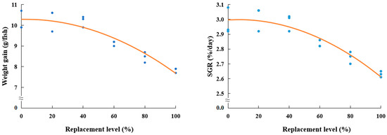Quadratic relationships between dietary fish meal replacement levels (%) with tuna by-product meal and weight gain (g/fish) (Y = −0.000272X2 + 0.001185X + 10.2893, adjusted R2 = 0.8729, p < 0.001), and specific growth rate (SGR, %/day) (Y = −0.000045X2 + 0.000657X + 2.9936, adjusted R2 = 0.8448, p < 0.001) of rockfish (Sebastes schlegeli).