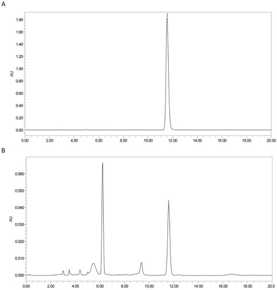 HPLC chromatogram of rosemarinic acid. Standard substances (A), PSM sample (B). Peaks labeled with the number 1 represent rosmarinic acid.