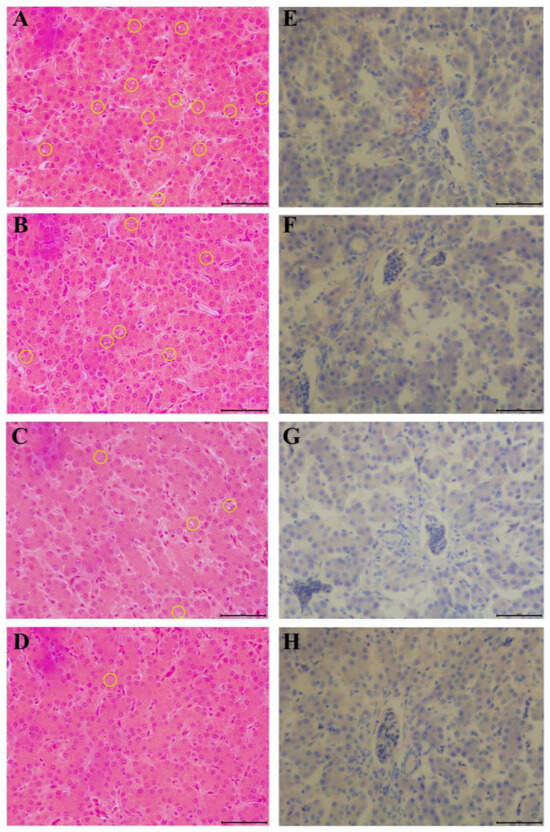 Measurements of hepatic steatosis in laying hens. (A–D) H&E staining of the liver, (E–H) their corresponding Oil Red O stains. (A,E) CON; (B,F) PSM-L; (C,G) PSM-M; (D,H) PSM-H. Microvesicular steatosis and medium vesicular steatosis are marked by yellow circles.