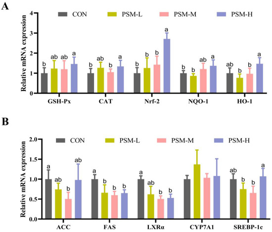 Effects of dietary PSM supplementation on the gene expression of liver antioxidant and lipid metabolism-related factors in hens. (A) liver antioxidant-related factors (GSH-Px, CAT, Nrf2, NQO-1, HO-1); (B) liver lipid metabolism-related factors (SREBP-1c, CYP7A1, FAS, ACC, LXRα). Values are the mean ± SD, n = 6. The different superscript small letters were judged as a significant differences, p < 0.05.