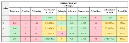 Isolates in which MIC values for cefotaxime and ceftazidime antimicrobials were >1 mg/L were subjected to further phenotypic characterization with a second plate EUVSEC2 (Figure 3).