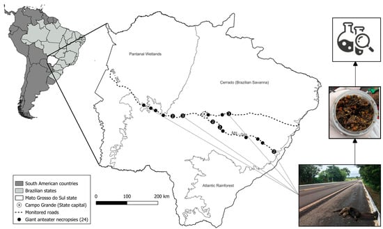 Stomach contents were collected from 24 road-killed giant anteaters along public roadways in Mato Grosso do Sul, Brazil (Figure 1). This study was performed under license No. 53798 (Chico Mendes Institute for Biodiversity Conservation) that granted permission to collect and store biological samples. The age of the carcasses was generally less than a few hours old, as determined by carcass condition. The date, GPS coordinates of the carcass, name of the road section, and sex of the animal were recorded. In the field, the stomach was separated by tying off the esophageal and pyloric sphincters with string before removing it from the animal.