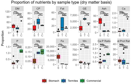 Figure 2 and Figure 3 compare the results from this study to published estimates of termite composition [,,,] and analyses of several commonly manufactured zoo feeds.