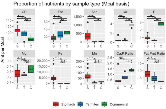 Finally, we compared the nutrient composition of the stomach contents to previously reported values for tamandua stomachs and termites [,,,] as well as several commercially available insectivore diets from the US and Brazil using analysis of variance (ANOVA). Commercial diets were analyzed at Dairy One Laboratories in Ithaca, NY, for proximate composition and minerals, gross energy, neutral detergent and acid detergent fiber, and acid insoluble ash using Association of Official Analytical Chemists-recognized wet chemistry procedures [] or, in the case of the Brazilian feed, using the manufacturer’s printed specifications.