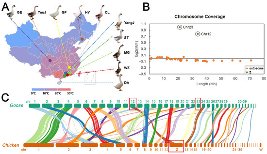 Sample location and Z chromosome identification. (A) Location of samples for this study. The color at the bottom indicates the corresponding annual average temperature for each province. (B) Male/Female coverage ratios for each chromosome, plotted by chromosome length. Each point represents a single chromosome, and the dark line is the theoretical expectation for autosomes (log2 (M/F coverage) = 0). (C) Collinear analysis of goose genome and chicken genome, and the red boxes indicate chromosomes 12 and 23 of the goose and Z chromosome of the chicken.