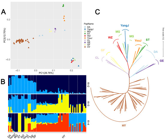 We performed population structure analyses on the Huoyan geese and nine local goose breeds of Southern China. The software tools VCFtools (v0.1.16) [17] and PLINK (v1.90) [18] were utilized to convert VCF files to PLINK format with stringent filtering parameters: --geno 0.1, --maf 0.1, and --indep-paiwise 20 10 0.5.
