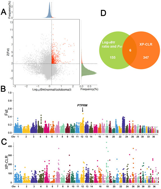 Selective sweep analysis of eyelid coloboma traits in Huoyan geese. (A) Results of FST and log10 (θπ ratio [normal/coloboma]) analyses. Horizontal dashed lines indicate the top 5% threshold of Z(FST), vertical dashed lines indicate the top 5% threshold of log10 (θπ ratio [normal/coloboma]), and red dots indicate the selected candidate regions for the eyelid coloboma. (B) Results of FST analyses. The black line indicates the threshold for the top 1% of FST values. (C) Results of XP-CLR analysis. The black line indicates the threshold for the top 1% of XP-CLR score. (D) Venn diagram of candidate genes identified using three selective sweep analysis methods.