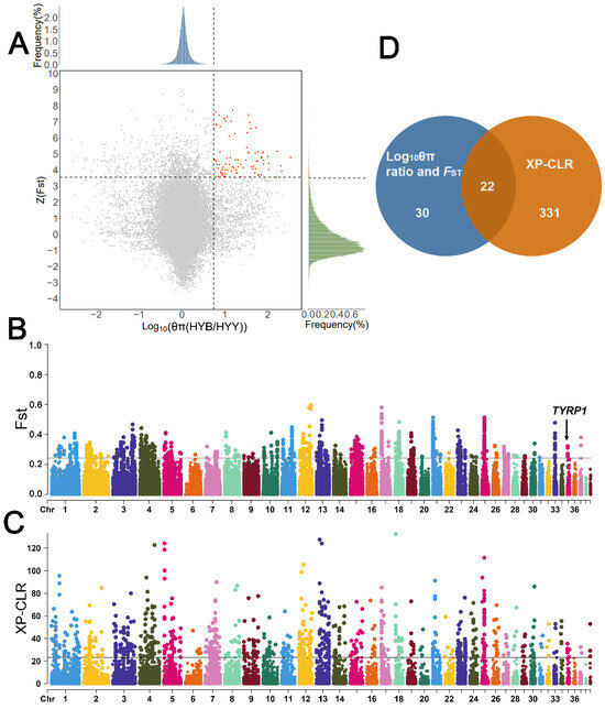 Selective sweep analysis of feather color traits in Huoyan goslings. (A) Results of FST and log10 (θπ ratio [HYB/HYY]) analyses. Horizontal dashed lines indicate the top 1% threshold of Z(FST), vertical dashed lines indicate the top 1% threshold of log10 (θπ ratio [HYB/HYY]), and red dots indicate the selected candidate regions for the yellow feathers color. (B) Results of FST analysis. The black line indicates the threshold for the top 1% of FST values. (C) Results of XP-CLR analysis. The black line indicates the threshold for the top 1% of XP-CLR score. (D) Venn diagram of candidate genes identified using three selective sweep analysis methods.