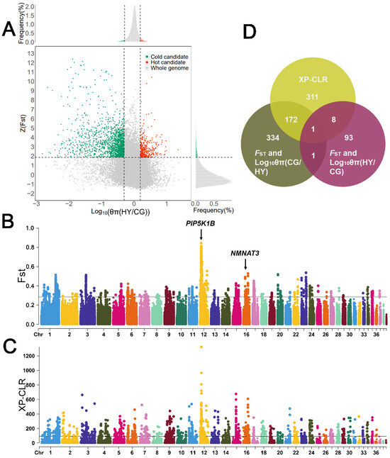 Selective sweep analysis of climate adaptations of Chinese local geese. (A) Results of FST and log10 (θπ ratio [HY/CG]) analyses. Horizontal dashed lines indicate the top 5% threshold of Z(FST), vertical dashed lines indicate the top 5% threshold of log10 (θπ ratio [HY/CG]), green dots indicate the selected candidate regions for the cold adaptation, and red dots indicate the selected candidate regions for the hot adaptation. (B) Results of FST analysis. The black line indicates the threshold for the top 1% of FST values. (C) Results of XP-CLR analysis. The black line indicates the threshold for the top 1% of XP-CLR score. (D) Venn diagram of candidate genes identified using three selective sweep analysis methods.