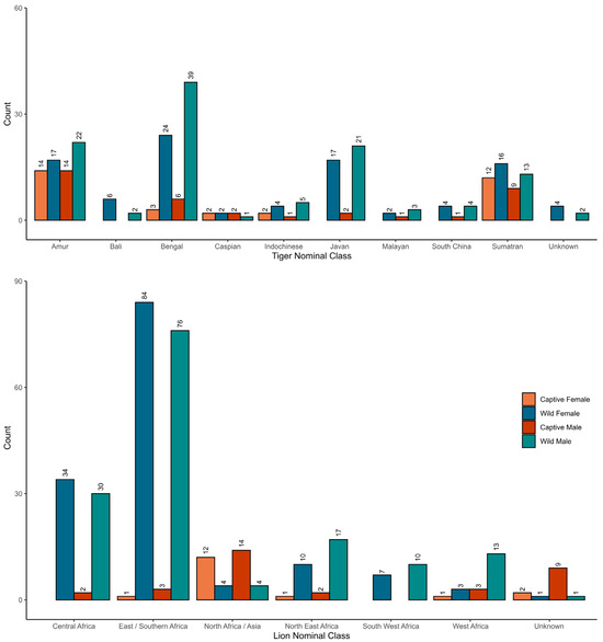 - Yamaguchi, N.; Driscoll, C.A.; Werdelin, L.; Abramov, A.V.; Cuisin, J.; Fernholm, B.; Hiermeier, M.; Hills, D.; Hunter, L.; Johansson, U.S.; et al. Locating Specimens of Extinct Tiger (Panthera tigris) Subspecies: Javan Tiger (P.T. Sondaica), Balinese Tiger (P.T. Balica), and Caspian Tiger (P.T. Virgata), Including Previously Unpublished Specimens. Mammal. Soc. Jpn. 2013, 38, 187–198. [Google Scholar] [CrossRef]