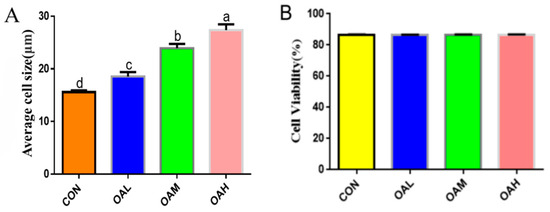 After 96 h of differentiation of the Yanbian skeletal muscle satellite cells induced by different OA concentrations, the effect of OA on the satellite cells was assessed by measuring the mean cell size and viability. The results revealed that the mean cell size was significantly increased in the OAL, OAM, and OAH groups (p < 0.05) compared to the CON group (Figure 1A), whereas no significant difference in cell viability (p > 0.05) was observed between the groups (Figure 1B).