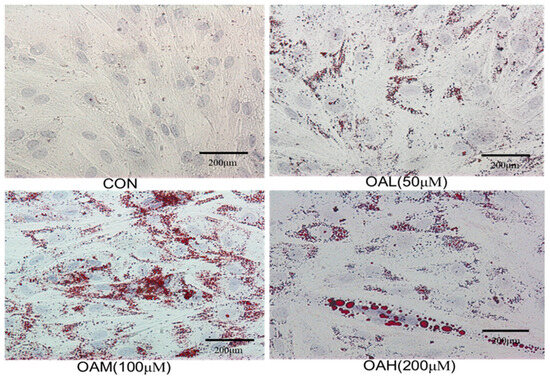 This experiment used the Yanbian bovine skeletal muscle satellite cells that had been identified and preserved by the Engineering Research Center of the Ministry of Education for Science and Technology Innovation of Beef Cattle in the Northeast Cold Region of Yanbian University. The liquid-nitrogen-preserved cells were revived, inoculated in cell culture flasks, and incubated at 37 °C with 5% CO2 in an incubator. The cell basal culture medium was changed every 24 h. After the growth density of the cells reached 80%, they were digested with 0.25% trypsin and added to eight 6-well plates, divided into four groups. Complete culture medium was added to each well to continue the culture. When the density of the 6-well plates reached 90%, the culture medium was aspirated. The cells were washed twice with PBS containing 1% PS. The differentiation medium containing different OA concentrations, prepared in advance, was added to induce lipogenic differentiation. The cultures were washed twice with PBS containing 1% PS. A blank control group (CON, 2% HS), a 50 µM OA treatment group (OAL, 2% HS + 50 µM OA), a 100 µM OA treatment group (OAM, 2% HS + 100 µM OA), and a 200 µM OA treatment group (OAH, 2% HS + 200 µM OA) were established. The differentiation medium was changed every 48 h in two 6-well plates for each treatment. After 96 h of differentiation, the cells and culture medium were collected for subsequent experiments.