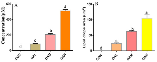 Effect of OA on triglyceride concentration (A) and lipid droplet area (B) of BSCs. Values with different superscript letters indicate significant difference (p < 0.05), whereas those with the same or no letter indicate that the difference is not significant (p > 0.05).