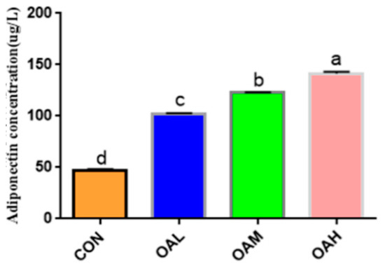 Effect of OA on the formation of bovine adiponectin. Values with different superscript letters indicate significant difference (p < 0.05), whereas those with the same or no letter indicate that the difference is not significant (p > 0.05).