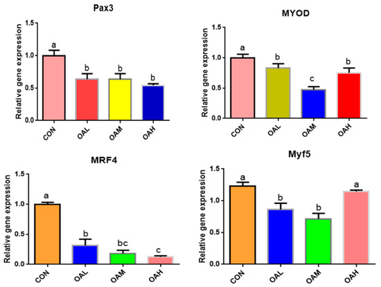 Effects of OA on the expression of myogenic-related genes. Values with different superscript letters indicate significant difference (p < 0.05), whereas those with the same or no letter indicate that the difference is not significant (p > 0.05).