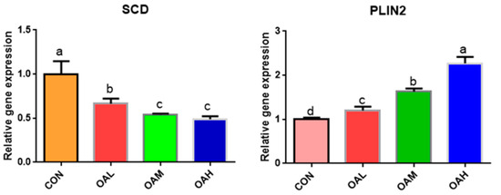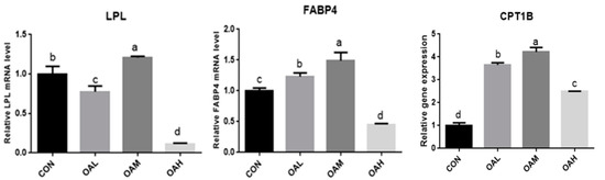Effect of OA on fatty acid-related gene expression. Values with different superscript letters indicate significant difference (p < 0.05), whereas those with the same or no letter indicate that the difference is not significant (p > 0.05).