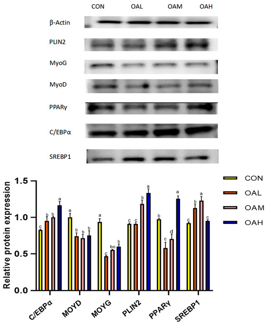 Following 96 h of induction with different OA concentrations, the protein expression levels of myogenic and lipogenic genes and the internal reference gene β-actin were detected through Western blotting. The results revealed that the expression of β-actin in the CON, OAL, OAM, and OAH groups was basically maintained at the same levels (Figure 8), which proved that the initial protein addition was consistent. Compared to the CON group, the protein expression levels of the lipogenesis-related genes PLIN2, C/EBPα and SREBP1 in the treatment groups exhibited an overall increasing trend, and those of the myogenesis-related genes, MyoG and MyoD, exhibited an overall decreasing trend. This was generally consistent with the trend of gene expression results.