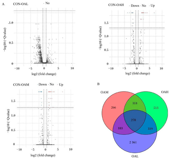 DEGs induced by different OA concentrations. (A) is a volcano map of DEG analysis. Red dots represent upregulated genes, blue dots represent downregulated genes, and gray dots represent genes that have not changed significantly. (B) is a Venn diagram of DEGs.