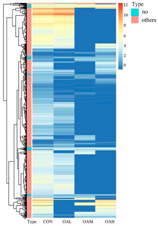 After 96 h of induction of the satellite cells by OA, results of the differential gene analysis (Figure 9A) revealed that, compared to the CON group, the OAL group had 3412 DEGs. Of them, 1168 genes were relatively upregulated, and 1973 genes were relatively downregulated. The OAM group had 1045 DEGs, of which 463 genes were relatively upregulated, and 582 genes were relatively downregulated. In the OAH group, 1428 DEGs were present, of which 704 genes were relatively upregulated, and 724 genes were relatively downregulated. As shown in the Wayne diagram, the combined analysis of these differential gene results revealed the presence of 278 DEGs in the satellite cells treated with different OA concentrations (Figure 9B). The clustering analysis revealed a clear pattern of differentially expressed gene grouping (Figure 10).