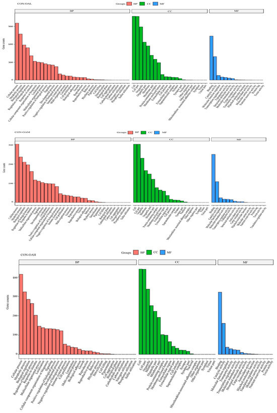 To explore the biological functions of these DEGs, the GO enrichment results of DEGs at different OA concentrations were analyzed. The GO terms were categorized into molecular functions (MFs), biological processes (BPs), and cellular components (CCs). The top 10 GO entries with the smallest p values, that is, the most significant enrichment, in each GO category were selected for display (Figure 11). Compared to the CON group, the DEGs in the treatment groups were involved in various biological processes, including cellular processes, metabolic processes, and bioregulatory processes. In the molecular function category, most gene functions were associated with binding activity, catalytic activity, and molecular function regulatory activity. Most genes in the cellular component category were enriched in cells, cell parts, and organelles.