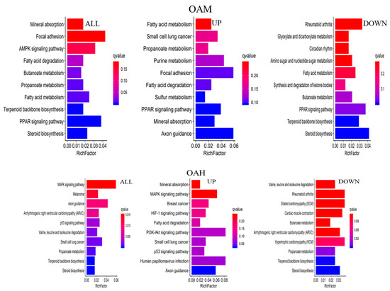 KEGG enrichment analysis of genes. The horizontal axis represents the enrichment coefficient, and the vertical axis represents the name of the pathway. The figure presents all the DEGs, the upregulated genes, and the top 10 signal pathways of the downregulated genes induced by different OA concentrations.
