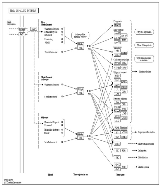 PPARs play a chief role in lipid metabolism [40]. So far, three different PPAR isoforms, designated α, β (δ), and γ, have been identified. PPARγ is a key transcription factor of anabolism and plays an important role in lipid synthesis [41]. In the present study, PPARγ mRNA expression was observed in the skeletal muscle satellite cells after OA induction. The PPARγ expression level in the satellite cells increased significantly with increasing OA concentration and exhibited a dose-dependent relationship. Moreover, several studies have shown that PPARγ regulates PLIN2 gene expression. To perform transcriptional functions, PPARs heterodimerize with RXR receptors and bind to their ligands, thus allowing for the transcription of their target genes (Figure 16), which have PPREs in their promoters, such as various lipid-metabolizing enzymes and proteins that constitute lipid droplets [42,43], while the PLIN2 gene promoter region 5’-AGGTGAAA GGGCG-3’ sequence is a PPARγ PPRE [44]. This suggests that PPARγ controls PLIN2 transcription through a functional PPRE located within the PLIN2 promoter, as was also observed from the signaling pathway analysis of the PLIN2 gene. In the presence of ligands, PPARγ regulates the expression of various lipid metabolism-specific genes by binding to PPREs in the promoter regions of downstream target genes such as SCD, FABPs, LPL, and lipid droplet-encapsulated protein (PLIN), thereby participating in the whole lipid metabolism process, such as lipid synthesis, transport, and deposition [45,46,47,48]. This is also consistent with the pathway view and the validation of adipocyte differentiation-related genes in the transcriptome data.