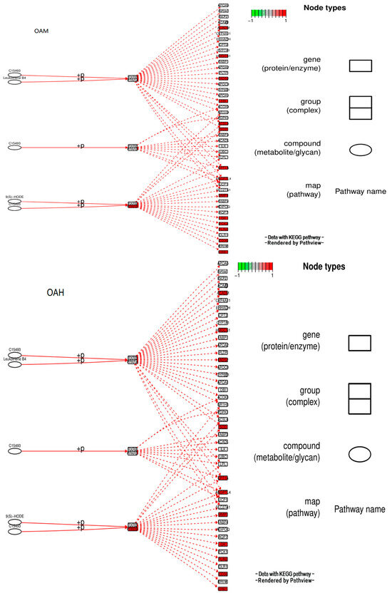 The major biochemical metabolic and signaling pathways associated with DEGs were explored through the KEGG enrichment analysis, and the top 10 enriched pathways were screened. Compared to the CON group, 1367 differential genes were annotated in the OAL group, which involved 86 pathways, and the most enriched pathways were the MAPK signaling pathway, thermogenic effect pathway, fatty acid metabolism pathway, etc. Among them, the 529 upregulated genes were mainly involved in the thermogenic effect pathway, ribosomal pathway, fatty acid degradation pathway, etc. The 838 downregulated genes were associated with the MAPK signaling pathway and cytokinesis pathway. In the OAM group, 444 genes were annotated, which involved 35 pathways, and the most enriched pathways were the PPAR signaling pathway, AMPK signaling pathway, fatty acid metabolism pathway, etc. Among them, the 203 upregulated genes were mainly involved in the PPAR signaling pathway, fatty acid degradation pathway, fatty acid metabolism pathway, etc. The 241 downregulated genes were mainly associated with the steroid biosynthesis pathway, PPAR signaling pathway, fatty acid metabolism pathway, etc. In the OAH group, 605 genes were annotated, which involved 57 pathways, and the most enriched pathways were the steroid biosynthesis pathway, MAPK signaling pathway, p53 signaling pathway, etc. Among them, the 289 upregulated genes were mainly associated with the p53 signaling pathway, fatty acid degradation pathway, MAPK signaling pathway, etc. The 316 downregulated genes were mainly involved in the steroid biosynthesis pathway, terpene skeleton biosynthesis, propionate metabolism pathway, etc. (Figure 12).