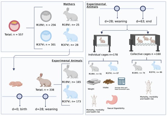 At 28 d of age, weaned rabbits were housed in individual and collective pens (178 rabbits housed in individual cages, 91 from R19V and 87 from R37V; and 160 rabbits were housed in collective cages, 74 from R19V and 86 from R37V). Individual pens (52 × 44 × 32 cm) were used to control performance traits and nutrient digestibility, mortality, and morbidity. The rest of the animals (n = 160) were located in 21 collective pens (152 × 44 × 32 cm), which were used to control mortality and morbidity.
